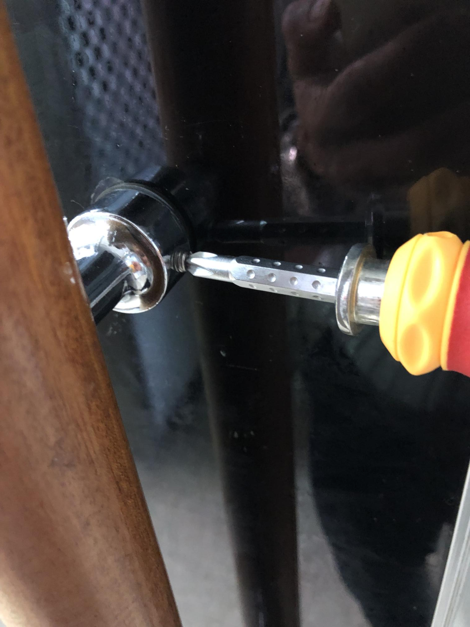 STEP 4 - 문 손잡이를 분해한 주변은 열심히 물티슈로 쓱쓱 닦아준다. 십자드라이버로 이용해 주변을 모두 조여준다. |